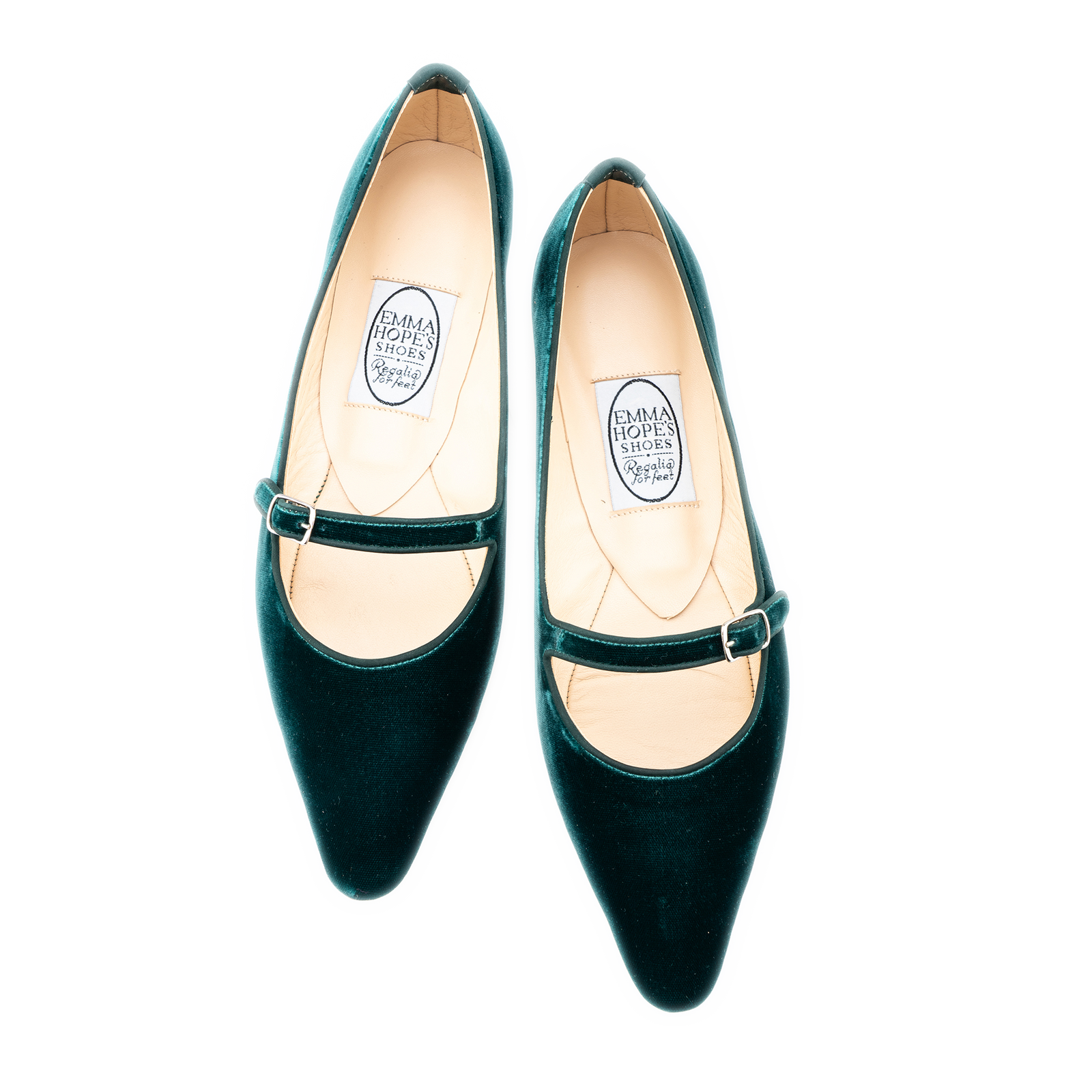 70's Strap and Bar Green Velvet Low Ballet on a slim stacked 15mm heel.