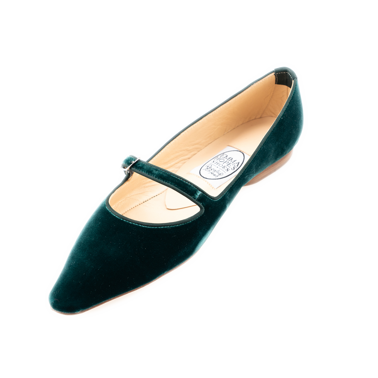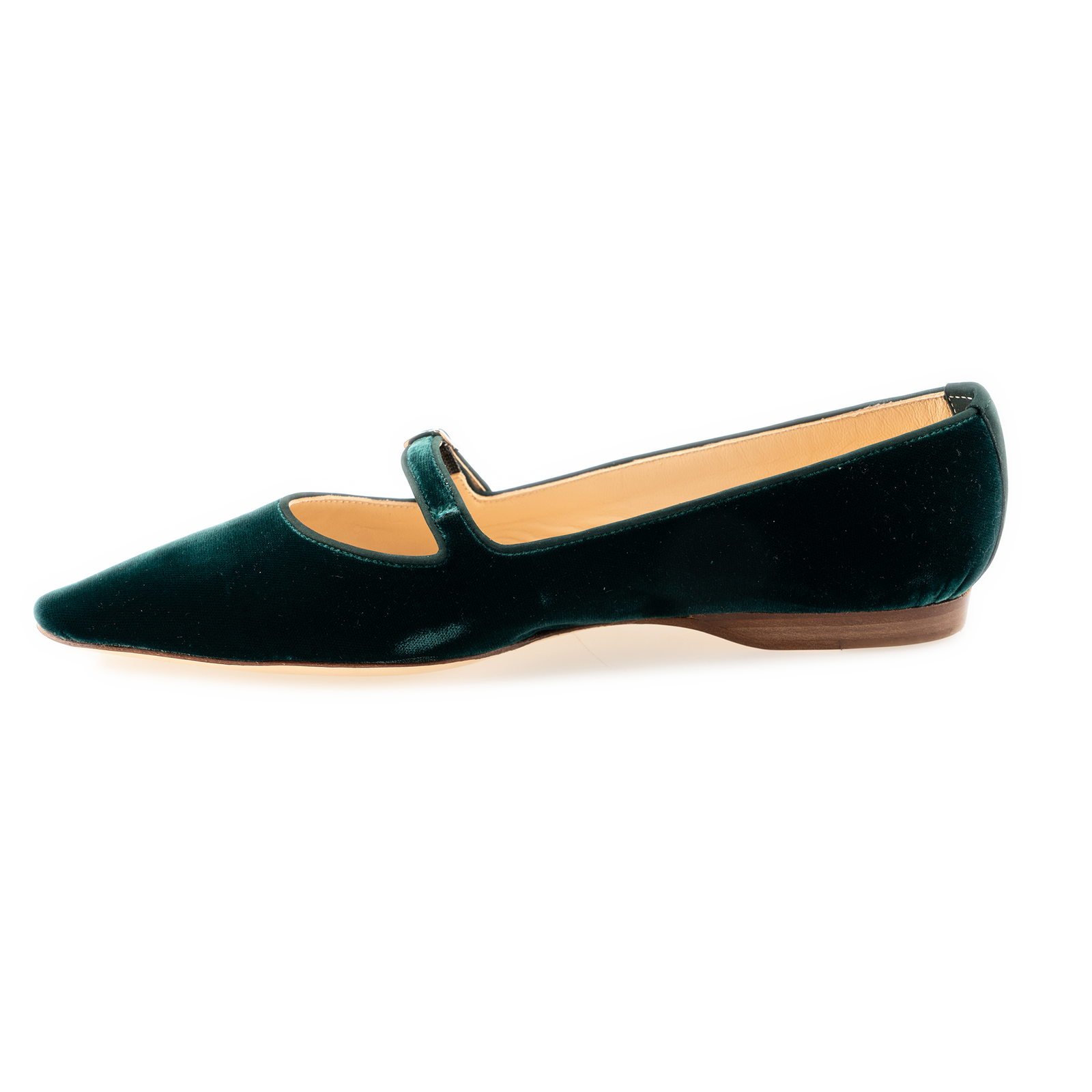 Style: Strap and Bar Low Pointy BalletUpper: Velvet Colour: GreenDetail: Low Sling Sole: Leather Lining: Leather Heel: 15mm Handmade in Italy