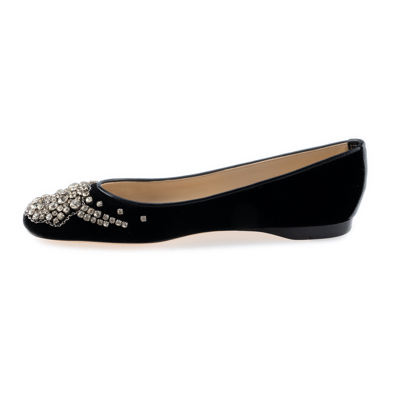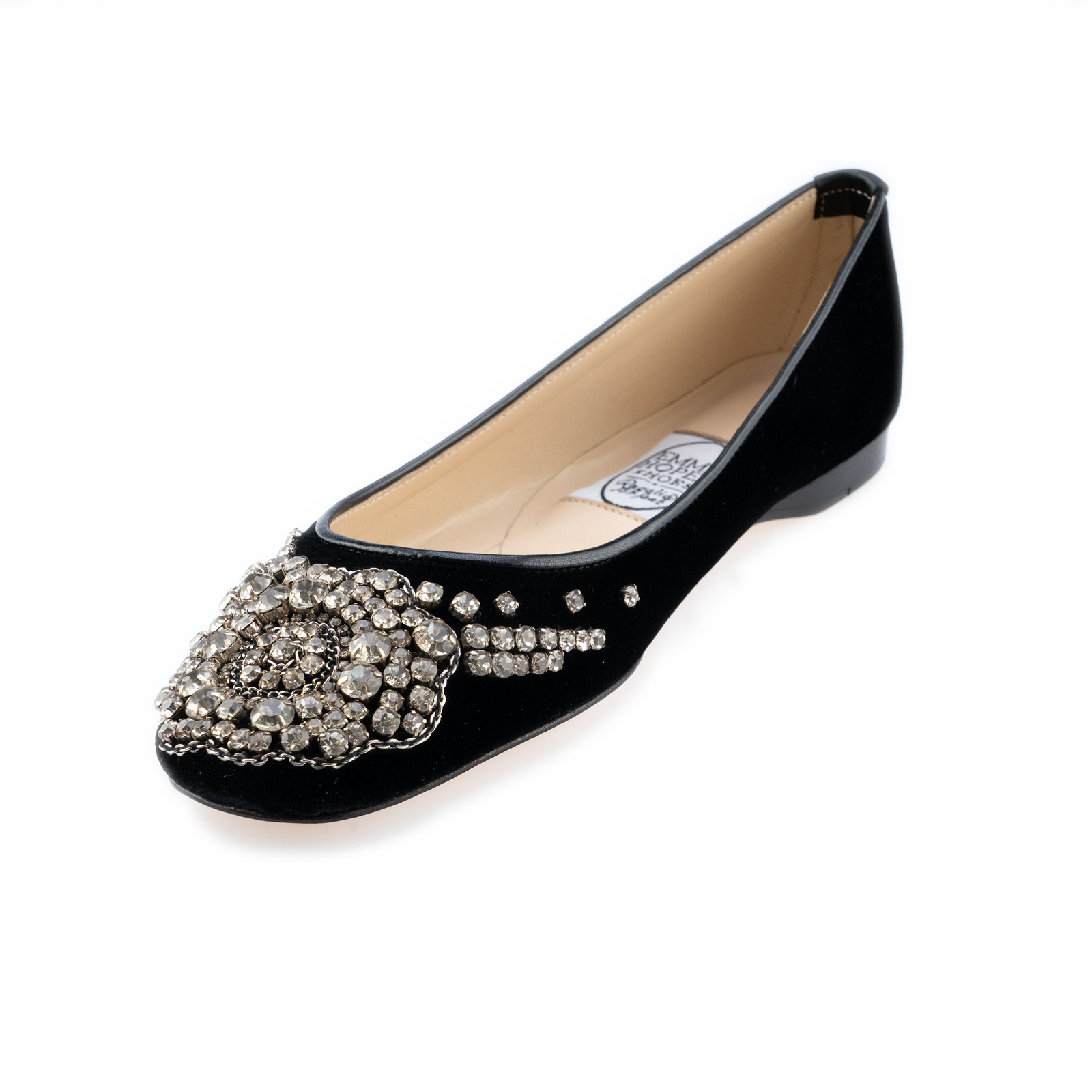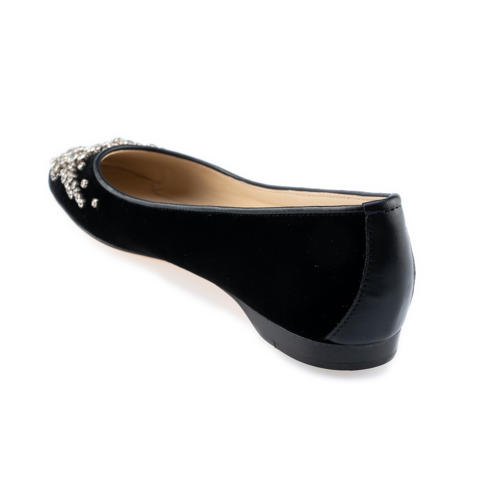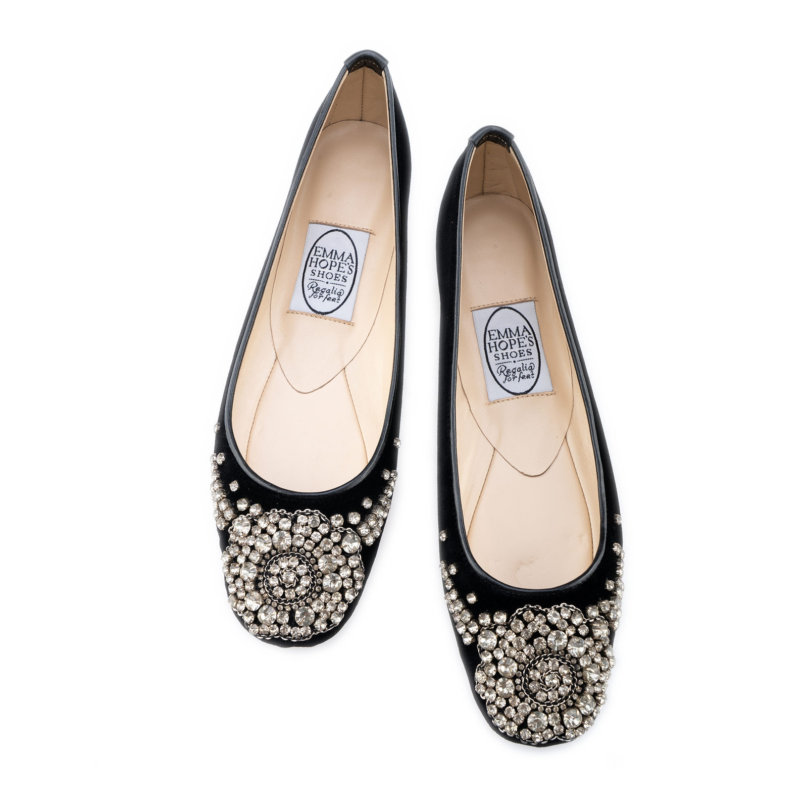 Inky blue silk velvet chisel toe ballet encrusted with diamond paste crystals and hand stitched chain detail on a 10mm flat heel.