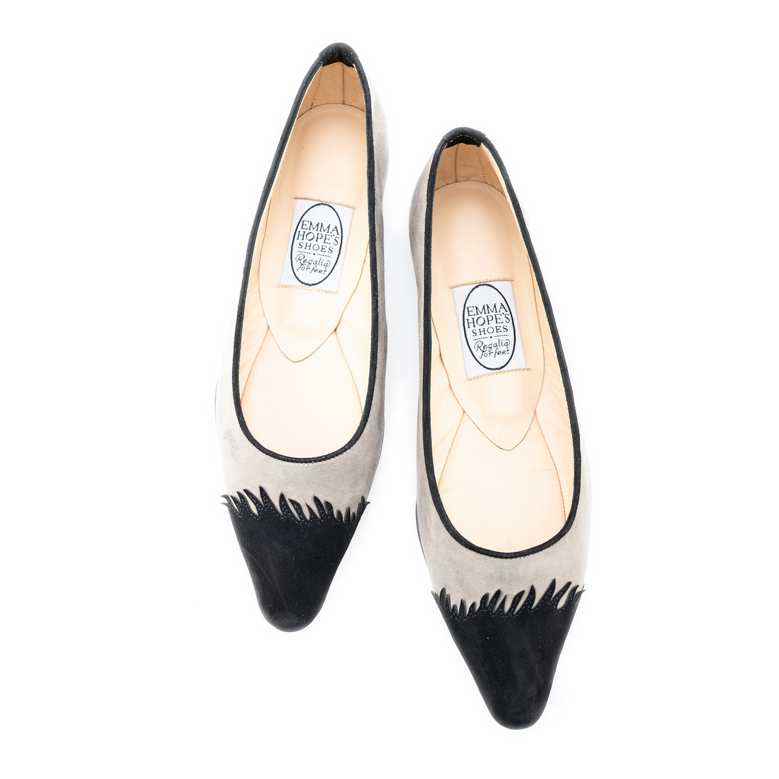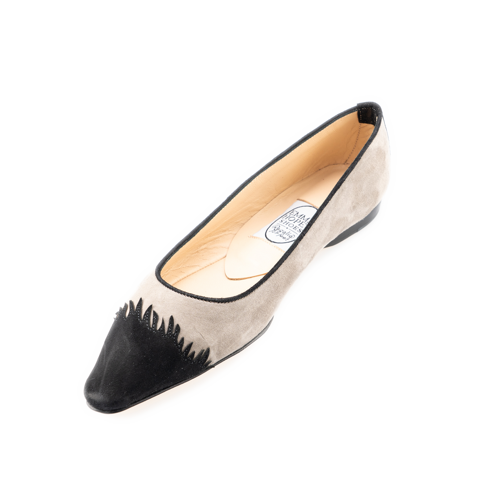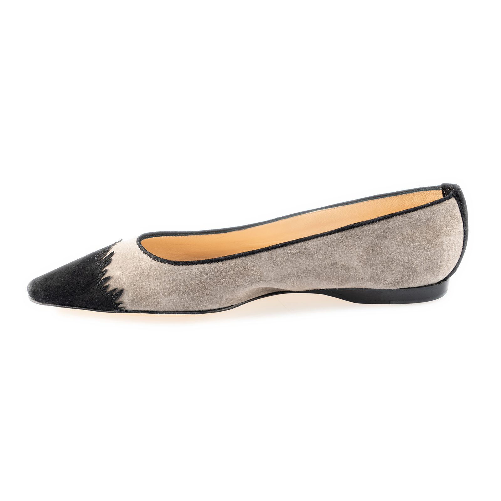 Style: Pointy balletUpper: SuedeColour: Taupe and BlackDetails: Brogueing DetailSole: LeatherLining: LeatherHeel: 10mmMade in Italy