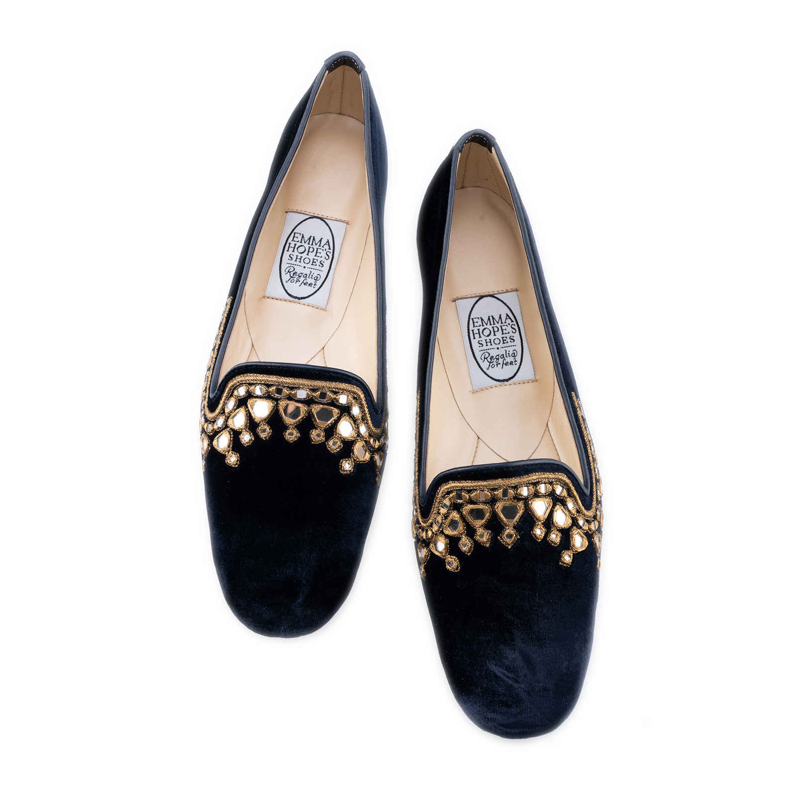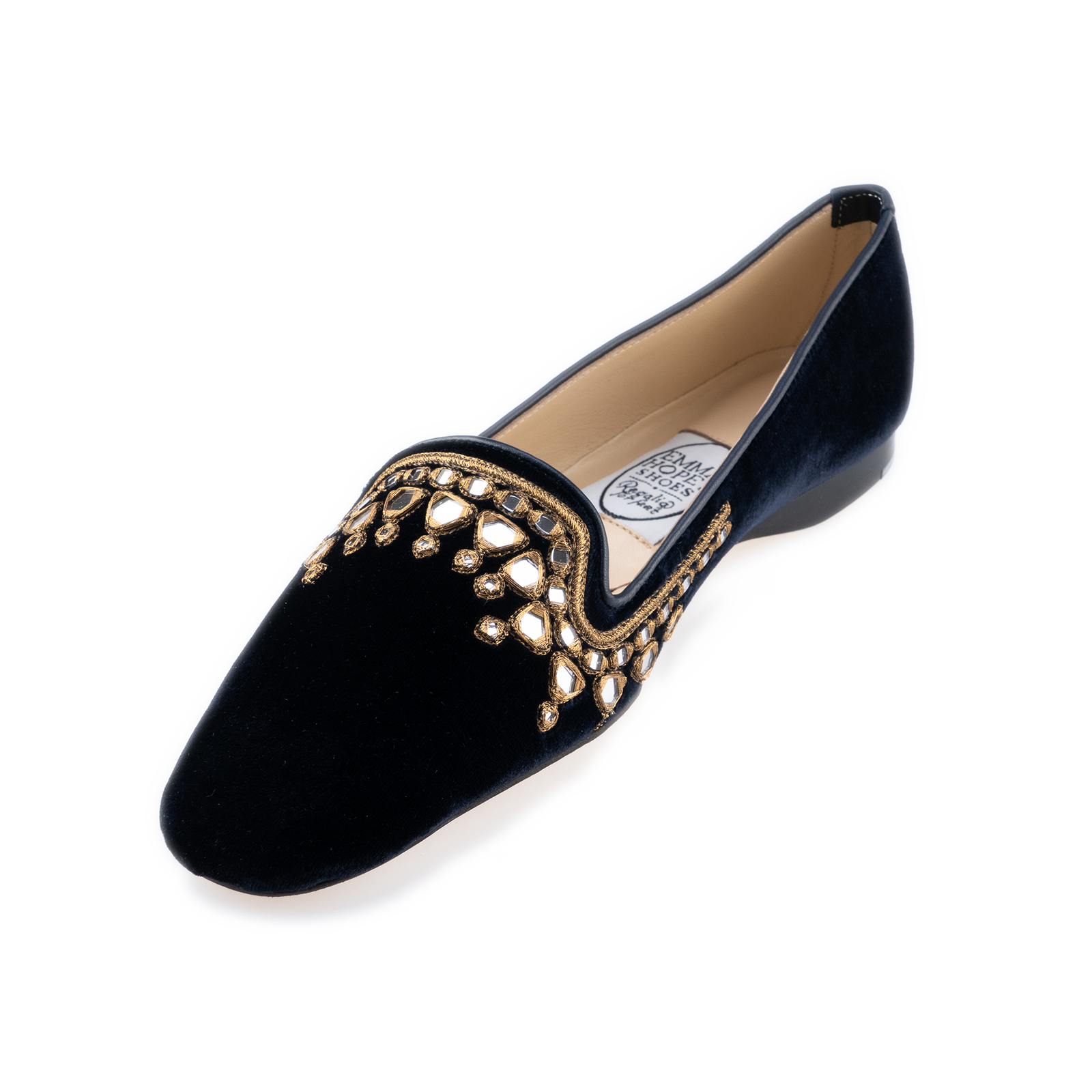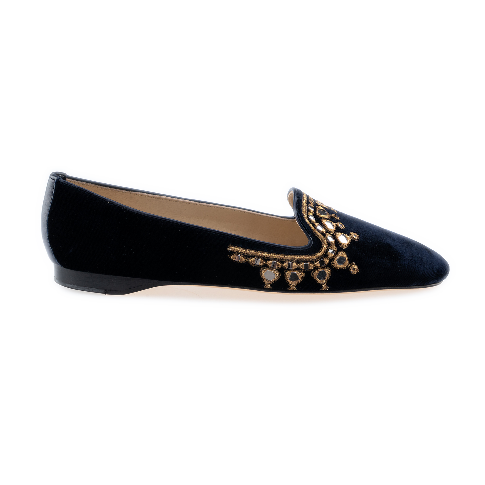 Navy Velet Mirrored paste encrusted, hand stitched embroidery Round toe Ballet with a slim stacked 70mm heel.